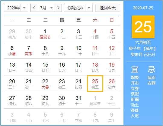 为了让客户更好的筛选搬家吉日,迁喜搬家特委托小编每个月都要公布更新一下搬家的好日子,2020年7月份的搬家吉日已经出炉,这个月搬家吉日比较多,迁喜搬家小编给您推荐的2020年7月份第九个搬家好日子是公元2020年07月25日,星期六,农历六月初五,庚子年癸未月己巳日,更多详细信息就让迁喜搬家推荐如下: