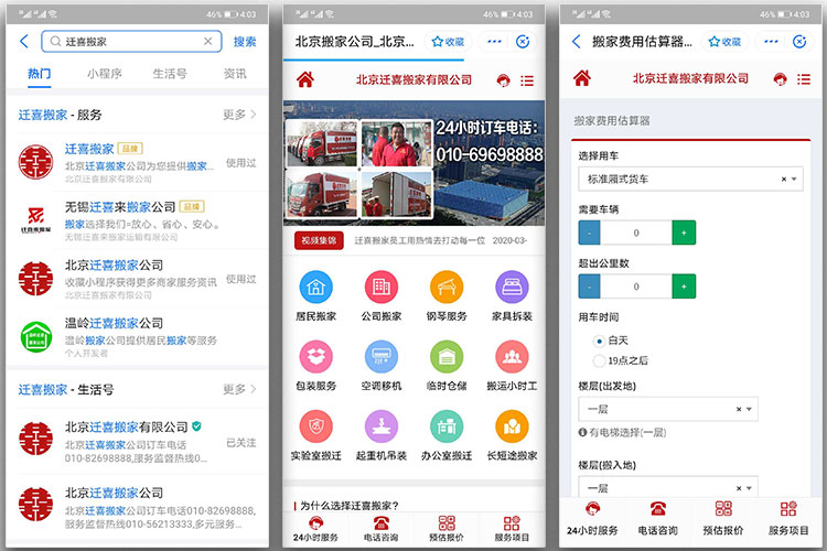 北京迁喜搬家公司继微信小程序、百度智能小程序上线后,支付宝小程序也成功上线了,迁喜搬家以品牌命名形式在支付宝小程序平台成功着陆,您在支付宝上可以体验到迁喜搬家搬家费用估算、在线下单,迁喜搬家为您24小时提供搬家服务,就近派车!